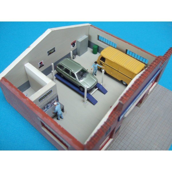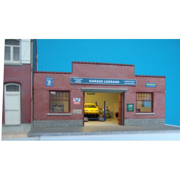 · Une planche de décorations représentant le panneau portant le nom du garage et des affiches de plusieurs marques de produits liés à l'automobile (marques d'huile, d'essence, d'amortisseurs, etc ...).